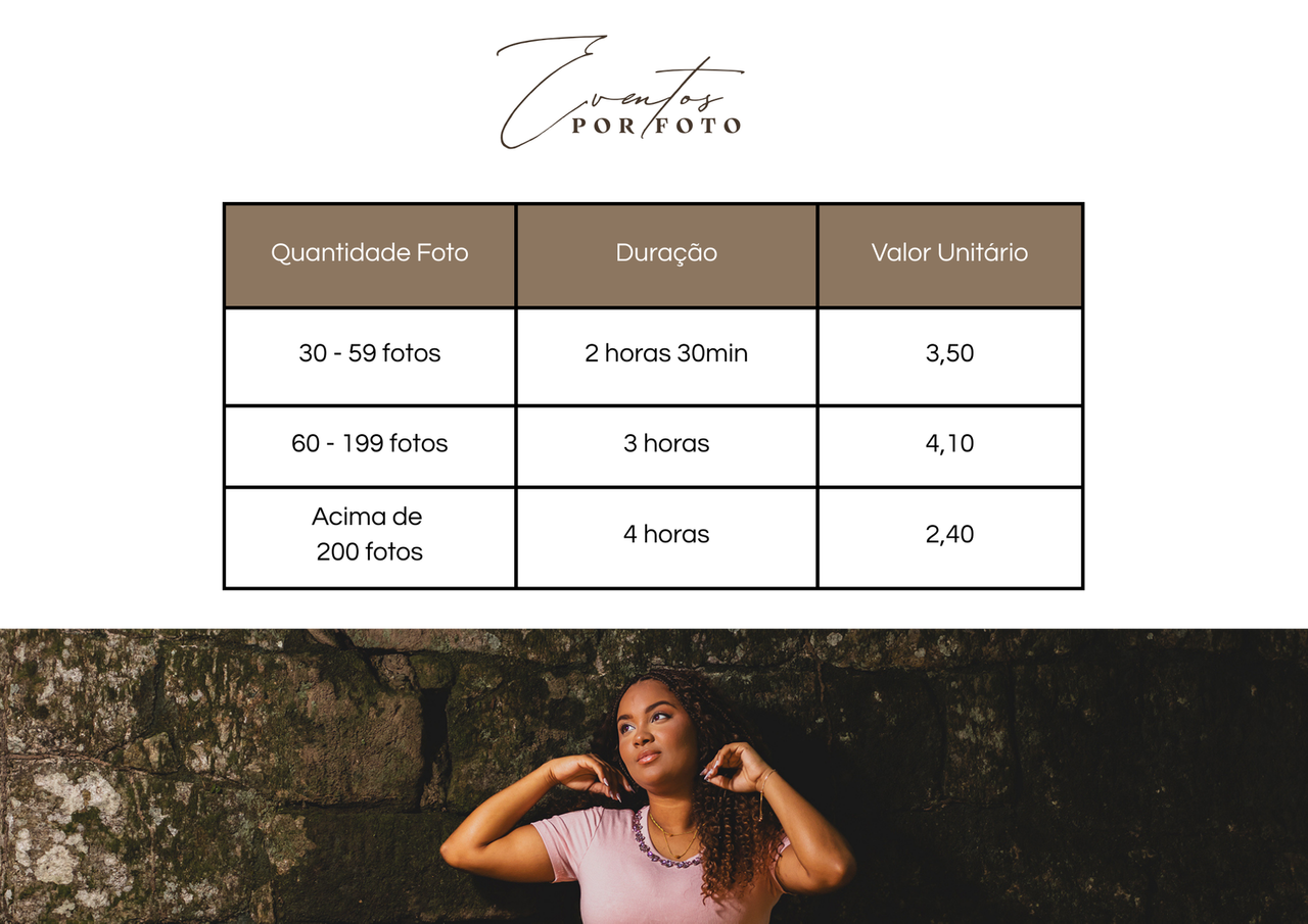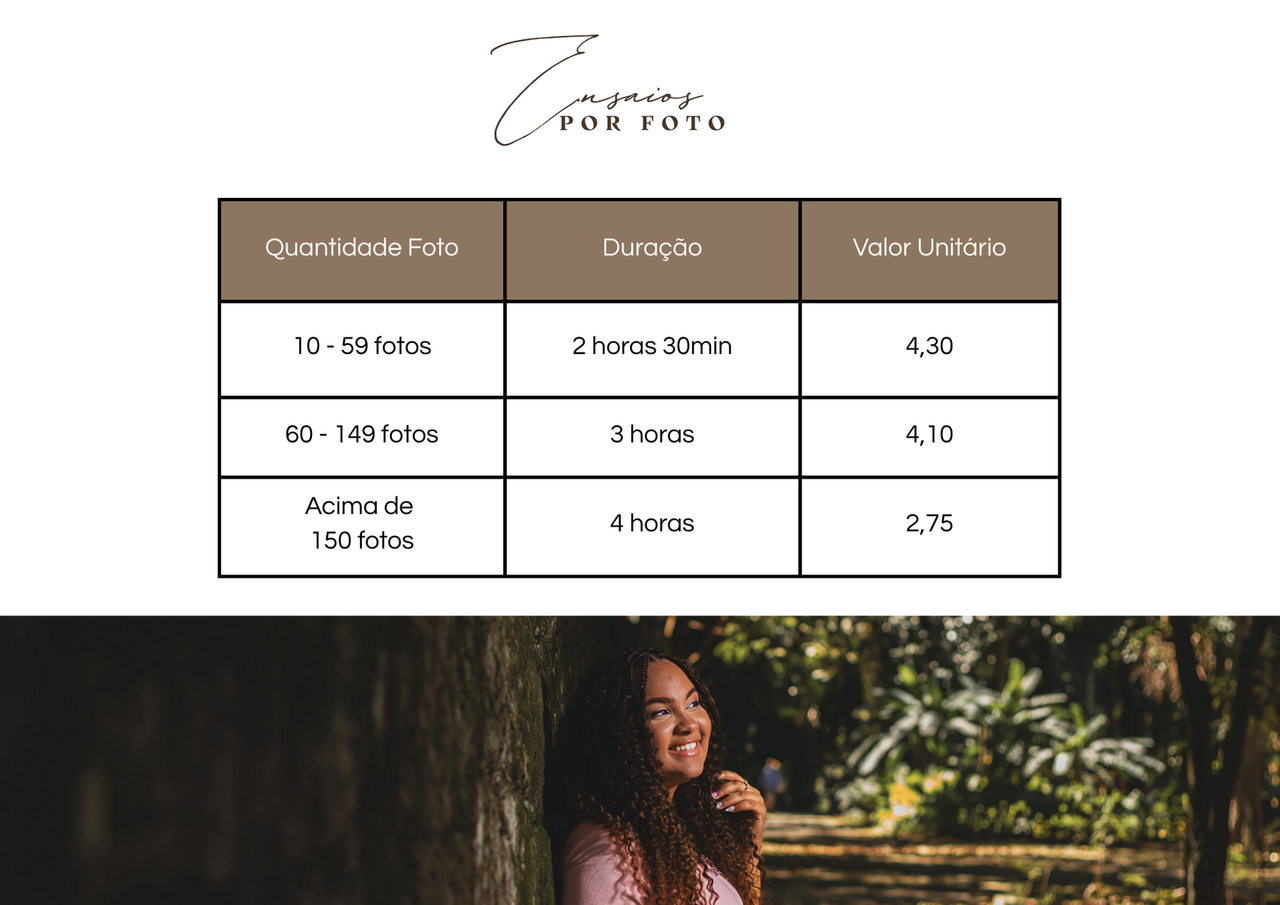 Disponibilizamos abaixo a calculadora de fotos para Ensaios e Eventos, que irá multiplicar de acordo com a tabela para você.